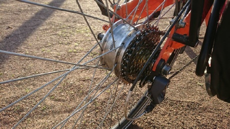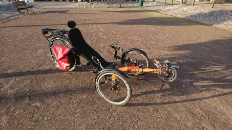 De fiets was oranje en in het achterwiel zat een motor. De fiets was nauwelijks gebruikt op deze manier. Accu lader en regeling. zaten er bij. Maar ik voelde me nog veel te jong voor elektrische ondersteuning