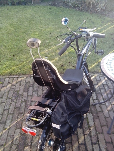 Ik heb een tas gevonden en binnen gekregen op 4-1-2014. Zondags 5-1 heb ik de tas er op gezet en het spiegeltje geplaatst en de fiets wordt binnenkort over gedragen aan Marcel om te gaan oefenen